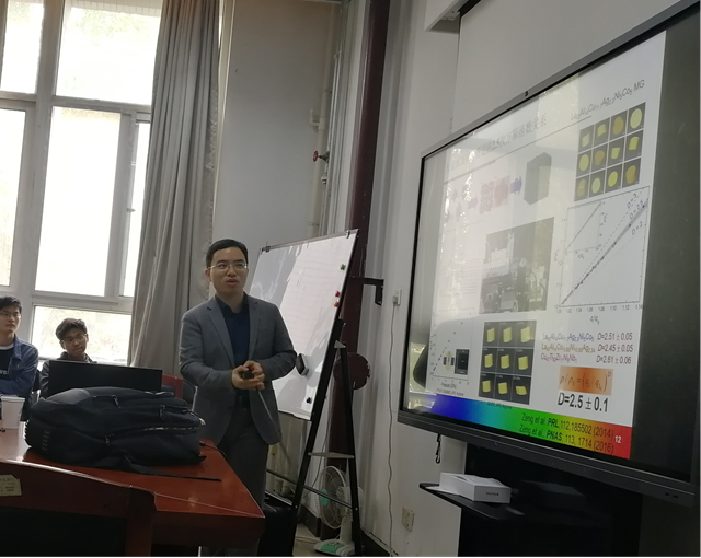 曾桥石博士作了题为“压力——无序合金研究的另一个维度”的学术报告。报告从压力对材料结构、性能影响这一角度出发,结合同步辐射等前沿的材料表征技术,讲解了如何利用高压作为一个独特的强有力调制参量来研究合金内丰富而有趣的结构和性质调控。同时他介绍了其在高压领域的一系列创新性的研究成果。如Ce基非晶合金在高压下由非晶向单晶结构的相变过程,非晶合金原子排布结构在压力条件下表现出的2.5次幂的独特规律,以及FCC、BCC高熵合金体系在高压下独特的相变路径等。参会老师和学生就报告内容展开了热烈的讨论。