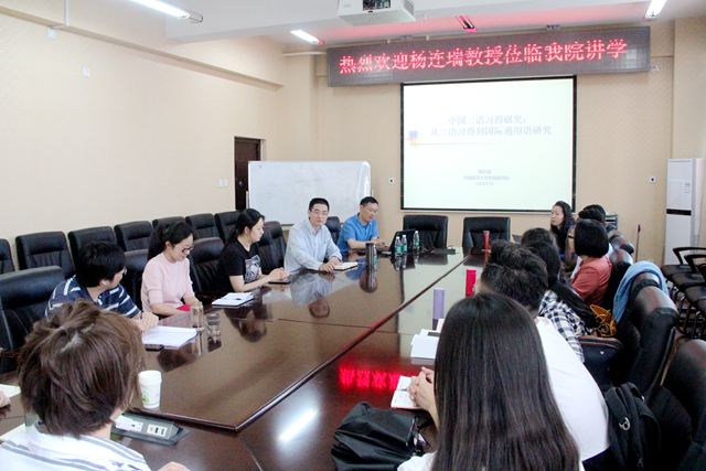 讲座之始,杨连瑞教授指出了二语习得现行研究中的一些问题和缺失,如重单一、轻整体;重习得,轻习失(attrition);重经验、轻科学;重静态、轻动态。在此基础上,他梳理了二语习得研究的几个发展阶段,从而引出通用语研究的必然性和必要性。他指出可以从语音、词汇、语法、语用等多层面研究通用语。杨连瑞教授强调,二语习得研究是一门交叉学科,在研究中我们要重视对二语习得方法论的研究和探索。最后他结合自己的研究重点介绍二语习得的研究课题,并指出了二语习得研究的相关应用。