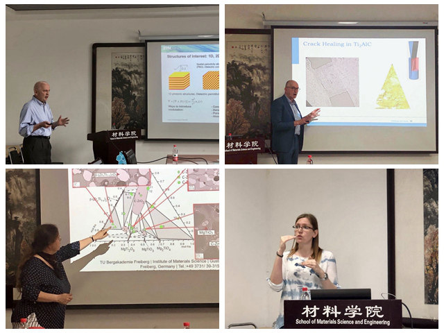 本次到访的外国专家在陶瓷材料及涂层材料方向均有较高的造诣,他们以各自研究领域的进展和前景为北理工师生带来了精彩、严谨的学术报告。Valery教授以大气再入情景的特殊性为入手点,详细介绍了面向该情景的光子热保护系统,并通过考核过程的蒙特卡洛模拟讲解其防护机理;Olga教授基于自身数十年在陶瓷相平衡领域的研究,带来题为《Experimental study and thermodynamic modelling in the ZrO2 based systems》的学术报告,着重介绍了基于ZrO2的系统的相平衡研究和热力学模拟的实验结果;Willem教授以《Autonomous oxidation induced crack healing in MAX phase ceramics》为题,详细介绍了自愈合MAX相自愈合材料的修复机理及其微结构表征方法;Denise博士则结合工程经验,介绍了提升燃气轮机效率和负载灵活性这一工业应用关键目标的核心技术,以及应用于发动机的热障涂层的制备及表征方法。