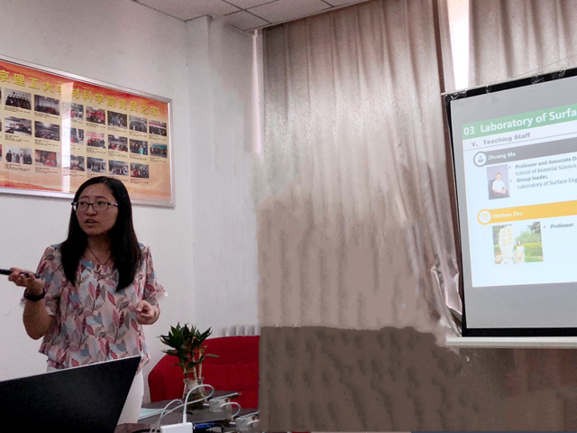 为增进双方相互了解,促成进一步的学术合作,我校青年教师刘玲代表表面工程课题组详细地介绍了学校、学院概况以及课题组科研情况,组内多名博士研究生就自身科研方向做学术报告,并与外国专家进行了深入地探讨。