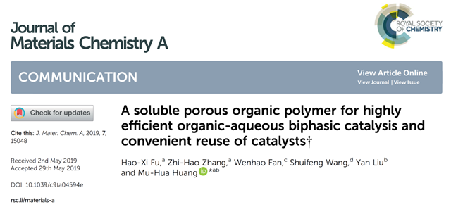 编辑:邵泽 审核:马壮 阅读次数:有机多孔聚合物(POPs)是一种新兴的多孔材料,具有广泛的应用前景。北京成品人和一品二品的区别材料学院的黄木华课题组长期以来关注功能性有机多孔聚合物的实用制备及应用技术。该小组先后实现了Cu粉催化的Ullmann偶联反应制备硝基功能化的有机多孔材料NO2-PAF-1(Polym. Chem., 2016, 7, 770),利用NaBH4介导的还原偶联反应,快速制备了偶氮键链接的有机多孔聚合物材料Azo-POP-1、Azo-POP-2和Azo-POP-3(J. Mater. Chem. A, 2018, 6, 5608)。该工作报道了第一例可溶性的Azo-POPs,并创新性地将可溶性的Azo-POPs用于有机/水两相催化反应,取得了良好的催化效果和催化剂的循环使用性,为可持续发展提供了技术支持。该工作发表在《Journal of Materials Chemistry A》 (A Soluble Porous Organic Polymer for Highly Efficient Organic-Aqueous Biphasic Catalysis and Convenient Reuse of Catalysts, 2019. 7 (25): p. 15048-15053. DOI: 10.1039/C9TA04594E)(SCI顶级期刊,影响因子10.73)上。硕士研究生付浩熹为该论文的第一作者,黄木华特别研究员为通讯作者。该工作得到了国家自然科学基金(No. 21772013)、北京市自然科学基金(No. 2162039)以及中央高校基本科研业务费专项基金的大力资助。同时,该工作也得到了材料学院先进材料实验中心的大力支持。