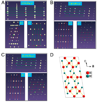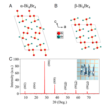 图1 (A)α-Bi4Br4和(B)β-Bi4Br4的准一维晶体结构;(C)α-Bi4Br4单晶的XRD衍射图。