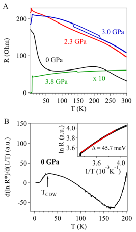 图2 (A)α-Bi4Br4单晶在不同压力下的电阻-温度依赖关系;(B)常压下α-Bi4Br4单晶的对数电阻随温度倒数的变化关系。