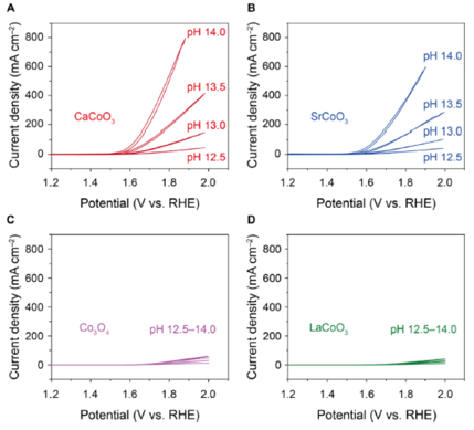 图4 CaCoO3 和SrCoO3与其它催化剂在不同pH条件下的OER性能对比