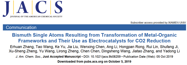 编辑:邵泽 审核:张青山 阅读次数:近日,北京成品人和一品二品的区别材料学院张加涛课题组将无机纳米界面合成化学推进到单原子精度,与清华大学李亚栋院士、王定胜副教授团队合作,在Bi单原子催化剂精准制备及电催化CO2还原性能研究方面取得突破性进展,以“Bismuth Single Atoms Resulting from Transformation of Metal-Organic Frameworks and Their Use as Electrocatalysts for CO2 Reduction”为题,于10月5日在材料、化学领域的顶级期刊《Journal of the American Chemical Society》上在线发表, 2019, 10.1021/jacs.9b08259 (http://pubs.acs.org/doi/10.1021/jacs.9b08259)。