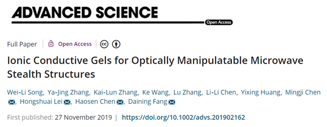 编辑:吴楠 审核:杨亚政 阅读次数:继2018 年11月17日方岱宁院士研究团队在著名材料学期刊 《先进功能材料》(Advanced Functional Materials, 2018, 1806383.)报道化学电源系统反向设计的电化学-力学-光学耦合仿生变色器件之后,11月27日,国际顶级综合性期刊《尖端科学》 Advanced Science, 2019, 1902162(期刊IF="15.804)在线报道了该研究团队最新的化学电源系统反向设计成果:首次基于透明化学电源电解质(第二类导体)设计多层光学可调电磁隐身结构(Ionic" Conductive Gels for Optically Manipulatable Microwave Stealth Structures)。