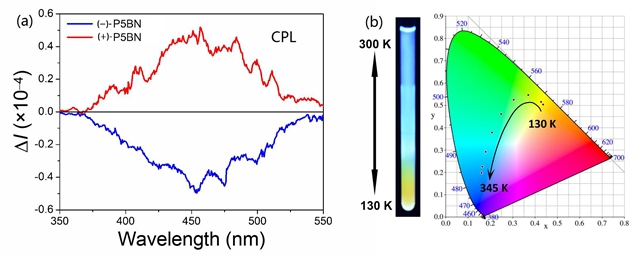 图2 (a) P5BN在固态CPL谱图;(b) P5BN热响应荧光变色现象。