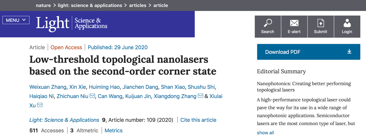 拓扑学关注的是物体在连续形变下所保持的全局不变的性质。将拓扑学的思想引入到光学微纳结构的设计,对实现鲁棒性的光场调控具有重要的意义,如实现背散射免疫的电磁波传输等。最近,以色列海法研究所的研究人员及其合作者利用拓扑保护的边界态构造了闭合环形腔,并利用该环形腔实现了激光效应,即所谓的拓扑激光(Science 359, eaar4003; eaar4005 (2018))。相比于传统激光器,基于拓扑边缘态的激光器在外界无序扰动的情况下,具有能量损耗低,激光发射效率高等优势。然而,目前所设计的拓扑激光器尺寸较大,阈值高,通常需要几毫瓦的泵浦才能产生激光效应。进一步实现低阈值的纳腔激光,对实现高效可集成的拓扑光源具有重要的意义。