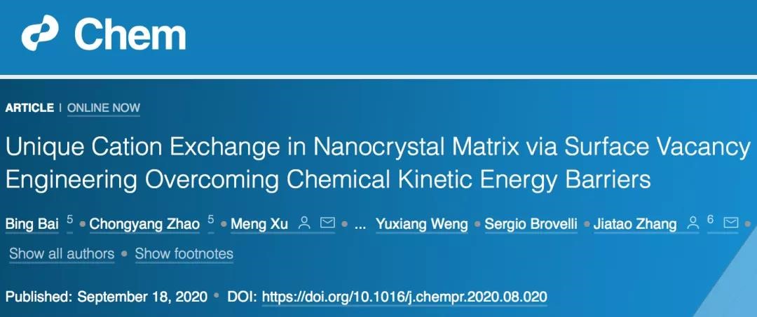 编辑:刘晓雪 审核:金海波 阅读次数:可控掺杂引起的精准能带工程是光电新能源应用的半导体纳米材料关键前提。近日,北京成品人和一品二品的区别张加涛教授团队利用表面空位成功克服离子交换反应当中的动力学势垒,创新性提出了新的合成方法,在制备双异价离子掺杂半导体纳米晶/量子点的研究中取得重要进展,相关成果以“Unique Cation Exchange in Nanocrystal Matrix via Surface Vacancy Engineering Overcoming Chemical Kinetic Energy Barriers” 为题,于Cell旗舰杂志《Chem》在线发表(IF:19.735)(文章DOI: 10.1016/j.chempr.2020.08.020)。