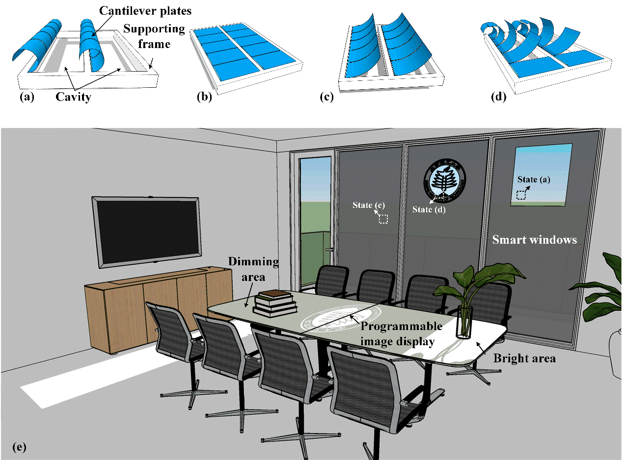 图1.(a)电热式Microshutter的开态;(b)关态;(c)半开态;(d)多态混合;(e)可连续控光Mircoshutter的应用场景:智能窗户。