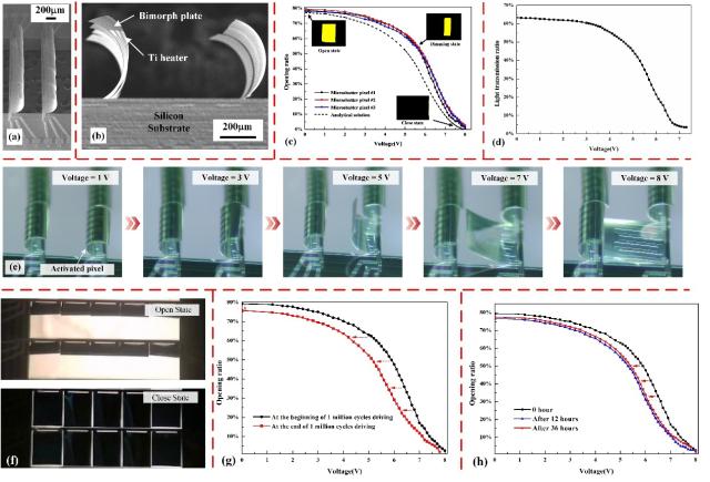 图2.(a)电热式Microshutter阵列的SEM图(俯视图);(b)电热式Microshutter阵列的SEM图(正视图);(c)单像素通光率与驱动电压的关系;(d)阵列通光率与驱动电压的关系;(e)Microshutter随驱动电压增加的形变示意图;(f)阵列的开关态;(g)百万次驱动可靠性测试;(h)长时间加电可靠性测试。
