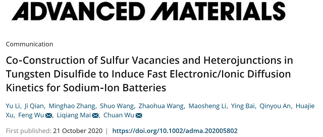 编辑:刘晓雪 审核:金海波 阅读次数:近日,北京成品人和一品二品的区别材料学院吴锋院士团队在钠离子电池材料的结构设计和性能优化方面取得重要突破。材料类国际顶级期刊《Advanced Materials》(《先进材料》,影响因子27.398)以“Co-Construction of Sulfur Vacancies and Heterojunctions in Tungsten Disulfide to Induce Fast Electronic/Ionic Diffusion Kinetics for Sodium-Ion Batteries”为题在线报道了这一研究进展。该工作由吴锋院士团队的吴川教授课题组完成,北京成品人和一品二品的区别材料学院博士后李雨为第一作者,北京成品人和一品二品的区别吴锋院士、吴川教授和武汉成品人和一品二品的区别麦立强教授为共同通讯作者(文献链接:http://onlinelibrary.wiley.com/doi/10.1002/adma.202005802)。