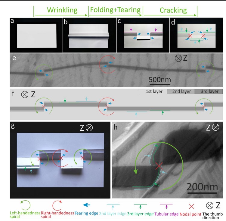 图1. 石墨烯褶皱折叠并撕裂后的初始化螺旋生长过程。通过扫描电子显微镜可以看出,相邻两个螺旋结构的手性相反。