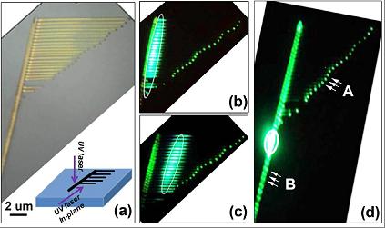 为此北京成品人和一品二品的区别纳米光子学与超精密光电系统北京市重点实验室的刘瑞斌副教授、硕士生张春花在邹炳锁教授带领下,在基金委青年基金、校创新团队基金、校重大预研基金等项目支持下,在一维半导体阵列结构制备及光子学行为的研究上取得了重要突破:利用本团队前期首次实现的II-VI族半导体周期性超晶格--CdS/SnS2一维光子晶体线(http://pubs.acs.org/doi/pdf/10.1021/ja1037963)为基体模板,通过反复试验,成功发明了一种一步气相法制备CdS一维单晶线阵列梳状结构的方法, 获得了角度可调、周期尺度可调的梳状结构,并与海外合作者研究了其微结构和高效的光波导行为(见下图),结果显示不同方向传播的光子耦合效率比量子线交叉传播大大增强,为下一步一维微纳光子器件的构建与应用打下了坚实的基础。