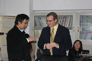 赵亚男副教授介绍了机械与车辆学院交通工程系的概况,并介绍了运输及物流研究所承担的国家自然科学基金委员会,重大研究计划和重点支持项目“无人驾驶车辆智能行为综合测试环境设计与测评体系研究”多个等重大项目。介绍了2013年11月2日-5日将在江苏省常熟市举办的2013年中国智能车未来挑战赛。James R.Sayer和鲍珊老师对中国智能车未来挑战赛很感兴趣,王建群教授和熊辉副教授分别向Dr. Sayer和鲍珊老师介绍了他们各自的研究领域和在研课题。