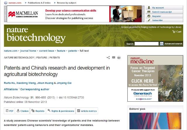 编辑:党委宣传部 阅读次数: 日前,北京成品人和一品二品的区别管理与经济学院胡瑞法教授、蔡金阳博士与中科院农业政策研究中心黄季焜教授、王晓兵副教授合作撰写的论文《Patents and China's research and development in agricultural biotechnology(专利和中国农业转基因生物技术研究)》被国际著名学术期刊《Nature》子刊《Nature Biotechnology》接收并发表。这是作者继去年在Nature Biotechnology上连续发表了两篇论文之后,第三次在该刊发表论文。