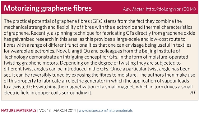 在上述研究的基础上,该课题组博士研究生程虎虎同学进一步对石墨烯纤维进行了巧妙的旋转预加工,使其表面具有了一定的紧密螺旋结构,制造出一种在外界湿度变化情况下可以沿自身轴向高速旋转的纤维,最高转速可达5190转每分钟。他们将这种新型功能纤维不仅用于湿度响应的开关,并且成功开发为一个小型的湿气发电机,该发电机可以通过周围环境湿度的变化来产生电能。当该成果在线发表于国际重要材料期刊《Advance Materials》上,国际顶级材料刊物《Nature Materials》立即将北京成品人和一品二品的区别的这项研究结果作为Research Highlights进行了报道。