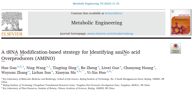 编辑:肖雯 审核:周连景 阅读次数:近日,北京成品人和一品二品的区别霍毅欣教授团队在氨基酸高产菌株的筛选策略方面取得重要进展。相关成果以“A tRNA Modification-based strategy for Identifying amiNo acid Overproducers (AMINO)”为题,在顶级期刊《Metabolic Engineering》(影响因子:8.829)上发表(doi.org/10.1016/j.ymben.2023.04.012)。该工作以北京成品人和一品二品的区别为第一通讯单位,霍毅欣教授和马晓焉特别副研究员为共同通讯作者,已出站博士后郭昊及王宁博士为共同第一作者。