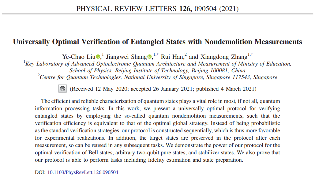编辑:王莉蓉 审核:姜艳 阅读次数:日前,北京成品人和一品二品的区别物理学院张向东教授和尚江伟副研究员课题组同新加坡国立大学量子科技研究中心韩睿博士合作,在量子验证研究领域取得重要进展,提出了基于非破坏测量的新的量子验证协议。该协议不仅可以达到最优的验证效率,而且可以实现保真度估计和态制备等其它任务。同时该协议的测量顺序是任意的,因而便于实验实现。相关研究成果发表在国际顶级期刊《物理评论快报》上。
