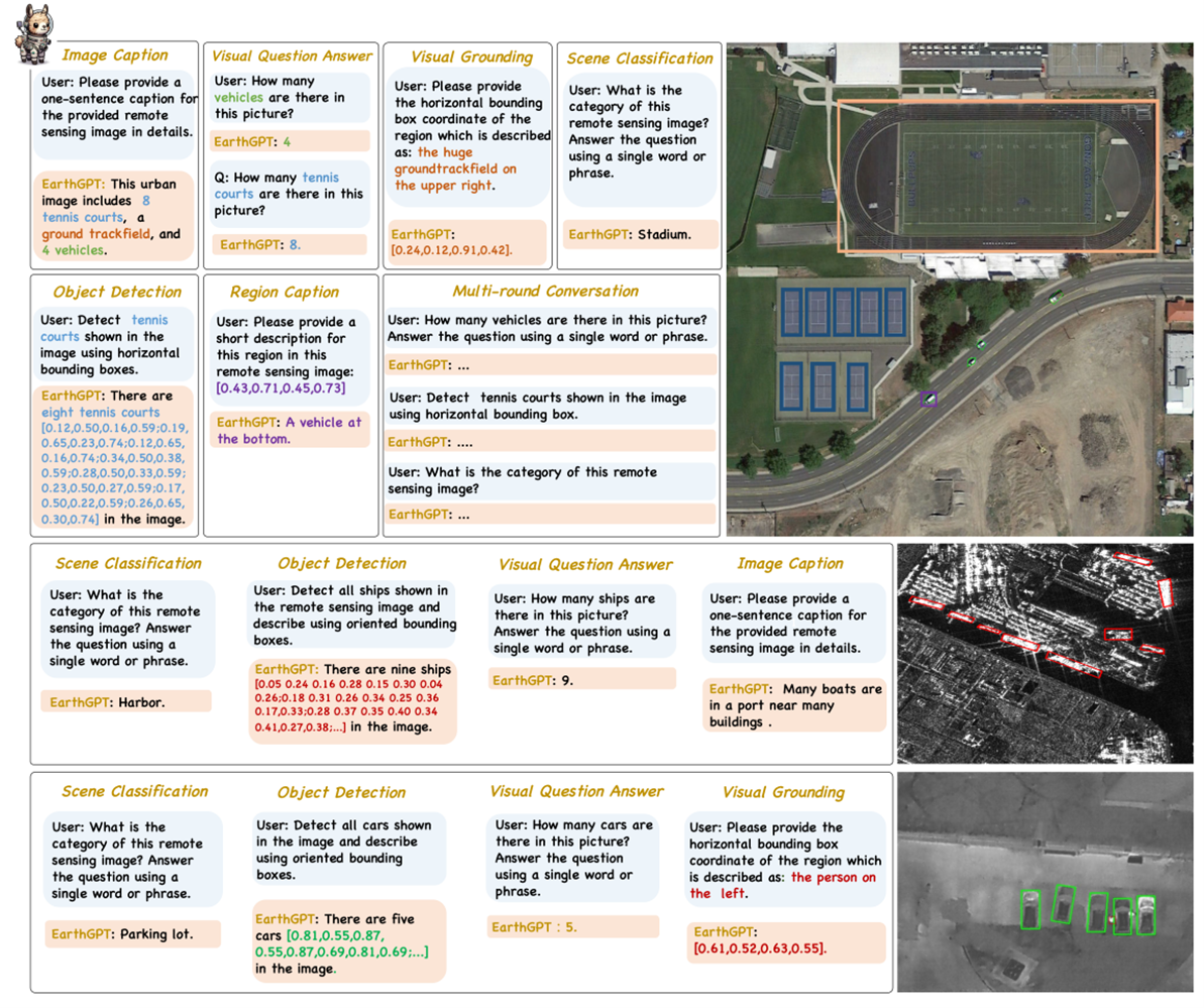 图1 EarthGPT可通过自然语言交互的方式,完成多传感器遥感图像解译和多视觉推理任务