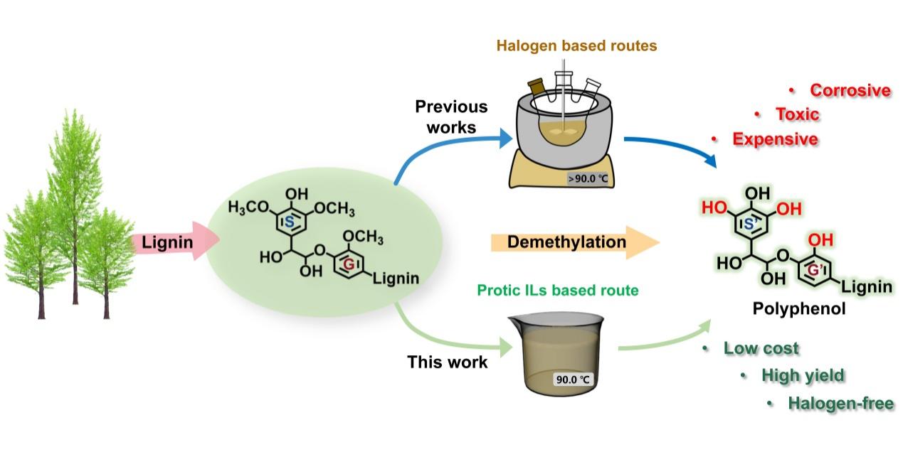 上述工作不仅实现了木质素在无卤素条件下的高效脱甲基化,而且具有成本低、反应条件相对温和、回收效果好等优点,对于木质素的高值化利用以及多酚工业的发展具有重要意义。