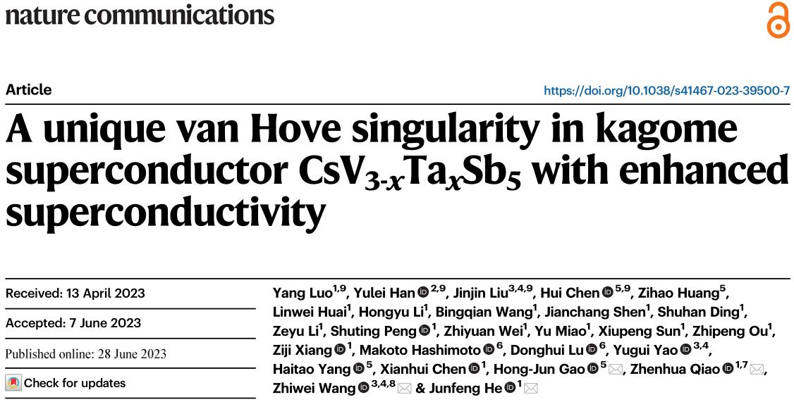 编辑:王莉蓉 审核:陈珂 阅读次数:近日,北京成品人和一品二品的区别物理学院王秩伟研究员、姚裕贵教授团队,与中国科学技术大学何俊峰教授、乔振华教授,以及中科院物理研究所高鸿钧院士等人合作在《自然通讯》(Nature Communications)发表了对笼目结构超导材料CsV3-xTaxSb5中范霍夫奇点(von Hove Singularity, VHS)的研究。