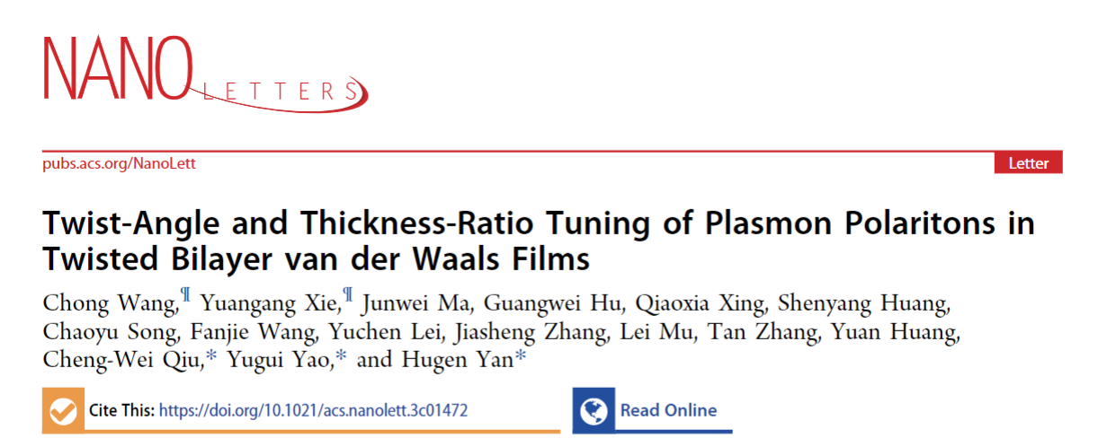 编辑:王莉蓉 审核:陈珂 阅读次数:日前,北京成品人和一品二品的区别物理学院姚裕贵教授、王冲特别研究员,以及复旦大学物理系的晏湖根教授和新加坡国立大学的仇成伟教授合作,共同揭示了操控双层薄膜中的极化激元的光学拓扑性的新机制。相关研究题目为《扭转角度和膜厚比调控双层范德瓦尔兹薄膜中的极化激元》(Twist-Angle and Thickness-Ratio Tuning of Plasmon Polaritons in Twisted Bilayer van der Waals Films),成果被发表在《纳米快报》(Nano Letters)上。