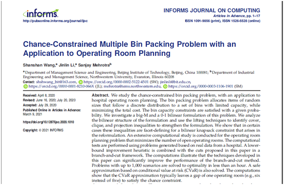 编辑:赵强 审核:颜志军 阅读次数:日前,北理工管理与经济学院李金林教授及其博士研究生王珊珊与美国西北大学工业工程与管理科学系Sanjay Mehrotra教授合作的研究成果“Chance-Constrained Multiple Bin Packing Problem with an Application to Operating Room Planning”近期在《INFORMS Journal on Computing》期刊在线发表。该项成果是在国家自然科学基金重点项目(71432002)支持下完成的。