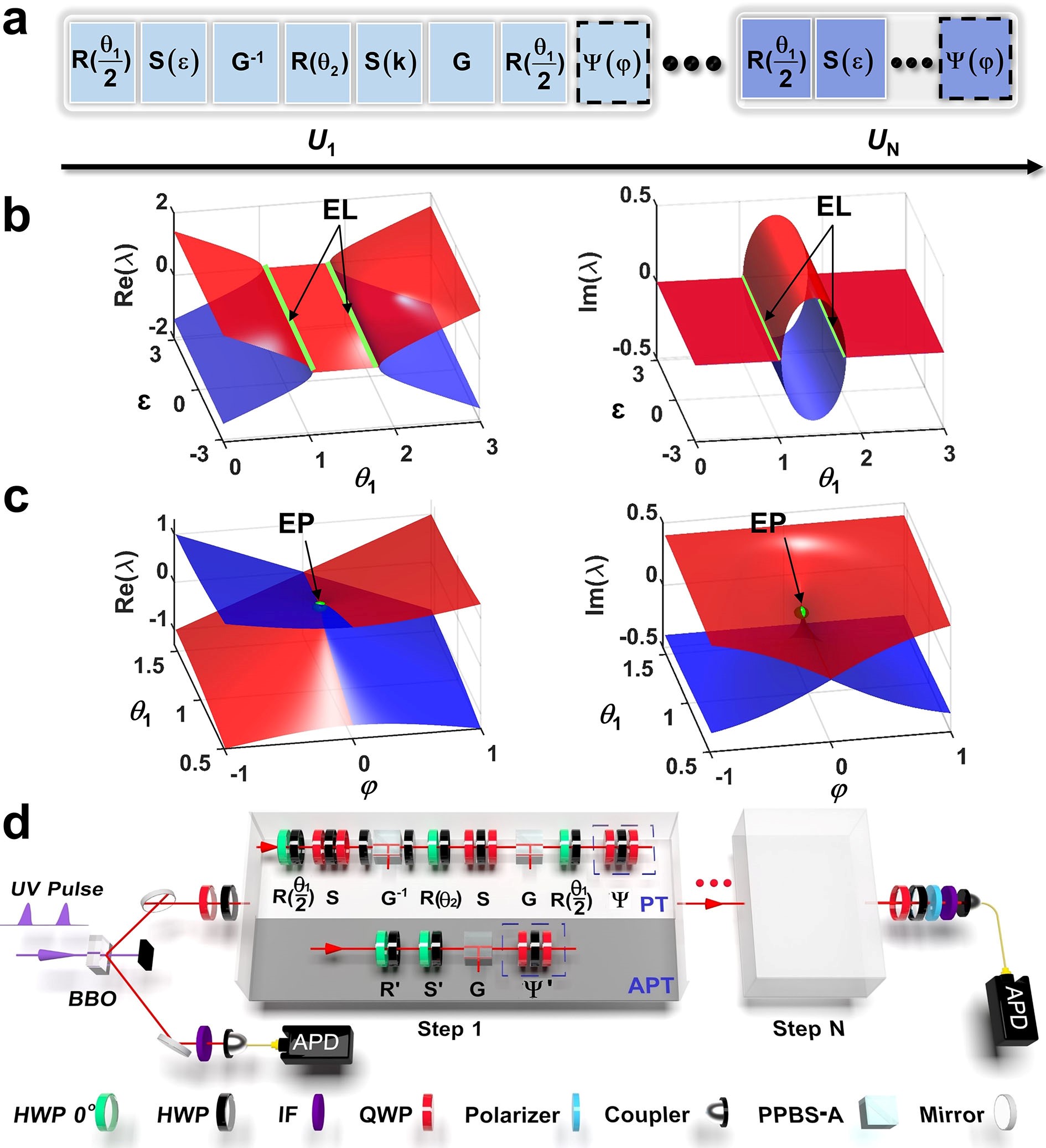 之前的研究都是使用哈密顿量来描述环绕奇异点的动力学特性。在该工作中,研究团队构造了非厄米量子行走来描述环绕奇异点或奇异线的动力学过程。如图1a所示是一个包含N步的非厄米量子行走系统来控制量子态的演化的示意图,其中第1步(N)的演化过程由时间演化算子 U 1 ( U N )描述。这里的非厄米量子行走是由多种算符组成的。以第一步为例,可以表示为。其中旋转算符形式为
