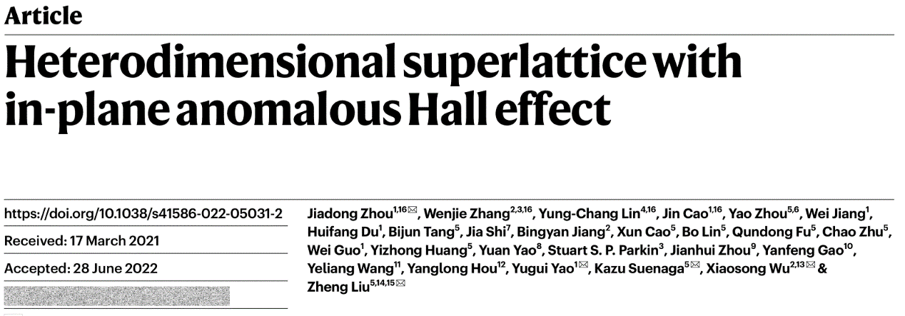 该工作首次利用CVD法成功制备了一种由不同维度物质组成的异维超晶格结构VS2-VS,并在该超晶格结构中首次观测到了室温下面内反常霍尔效应。本文的研究工作不仅实现了不同维度超晶格结构的合成,开拓了超晶格体系,更进一步观测到基于该体系的面内大反常霍尔效应,为凝聚态物理的研究开辟了新的道路,这对于下一步研究并探索电学、磁学等新奇物性提供了新的思路。