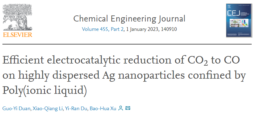 编辑:段凯龙 审核:王振华 阅读次数:近日,北京成品人和一品二品的区别徐宝华教授团队在构筑聚离子液体-银(PIL-Ag)杂化材料用于高效电催化二氧化碳(CO2)制一氧化碳(CO)方面取得重要进展,相关研究成果发表在国际化学工程领域顶级期刊《Chemical Engineering Journal》上,题为“Efficient electrocatalytic reduction of CO2 to CO on highly dispersed Ag nanoparticles confined by Poly(ionic liquid)”。北京成品人和一品二品的区别为唯一作者通讯单位,化学与化工学院徐宝华教授为该论文的通讯作者,段国义预聘助理教授为该论文的第一作者。