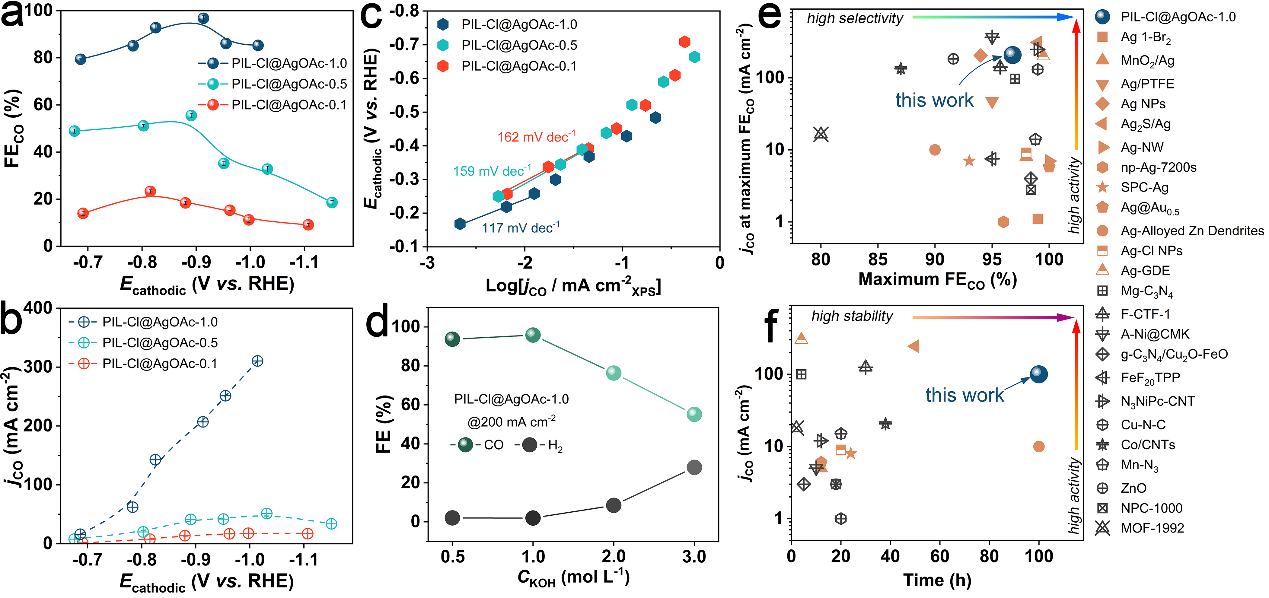 在前期工作中,徐宝华教授团队构筑了系列PIL-单金属/双金属杂化材料,实现了大电流密度、高选择性、高稳定性的电催化CO2/CO至C2+产物转化,揭示了PIL-金属界面性质对反应路径的调控以及PIL对金属高度分散的作用( Angew. Chem. Int. Ed. , 2022, 61: e202110657; Appl. Catal. B. Environ. , 2021, 297: 12047; Appl. Catal. B: Environ. , 2022, 313: 121459; Chem. Eng. J., 2023 , 451: 138491; Fundamental Research , 2022, 2: 937)。在本工作中,通过简单浸渍法在PIL中引入Ag盐,合成了系列PIL-Ag杂化材料。PIL对于原位生成的高分散Ag–Cl物种具有显著的限域效应。PIL中阳离子骨架结构与Ag盐种类直接影响Ag(I)络合物、Ag–Cl簇和Ag–Cl纳米粒子的形成与演化。得益于PIL中高度分散的咪唑-吡啶-咪唑三齿螯合位点与适当的Ag+供给速率,制备了最优的PIL-Cl@AgOAc-1.0杂化材料。在1 M KOH溶液中,–0.91 V(相对可逆氢电极)电位下,实现了96.8%的高CO法拉第效率与207.0 mA cm–2的偏电流密度。此外,该催化剂在100 mA cm–2下持续电解100小时依然保持较高的CO法拉第效率(~86%),体现了优秀的催化稳定性。机理研究表明,尽管三种Ag–Cl物种具有相似的内在活性,但Ag–Cl物种的分散形式、活性位点的数量以及反应物的传质共同决定了高反应速率下表现出的表观电催化性能。