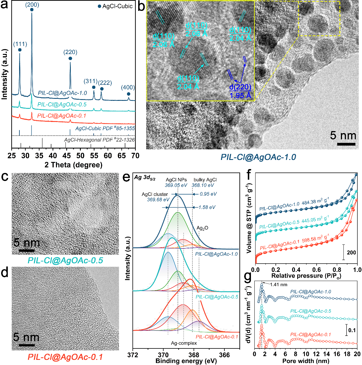 结构表征表明Ag的浸渍量影响Ag–Cl物种的存在形式:小浸渍量时以Ag(I)络合物为主,中等浸渍量时以Ag–Cl簇为主,大浸渍量时则以Ag–Cl纳米颗粒为主。TEM结合XRD揭示了Ag–Cl纳米颗粒为罕见的六方晶相AgCl,表明PIL骨架结构对Ag–Cl纳米颗粒的形成具有限域效应。