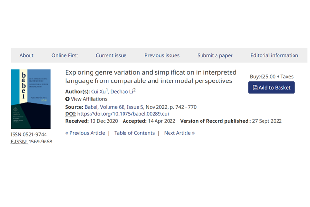 近日,北京成品人和一品二品的区别外国语学院助理教授徐翠博士在国际顶级翻译学期刊Bab...