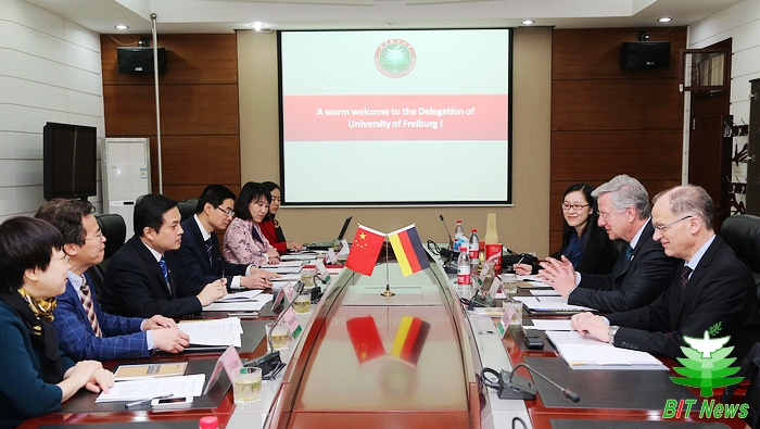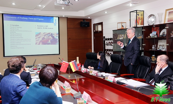 Schiewer校长感谢胡海岩的热情接待,并详细介绍了弗莱堡大学的专业设置、科研、国际化办学情况。他说,弗莱堡大学是一所综合型大学,理科与工科是学校的重要内涵,与科技界与产业界合作非常广泛,这次访问对北理工的学术实力印象深刻,希望在自然科学和工程领域与北理工开展教师互访、学生交流与合作研究。