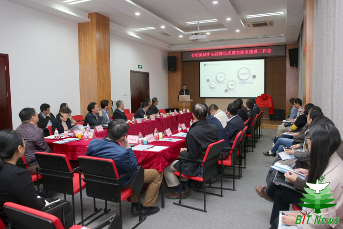 编辑:郭强 审核:龙腾 阅读次数:2016年10月20日,分析测试中心挂牌仪式暨实验室建设工作会在良乡校区工业生态楼118举行。我校党委书记赵长禄、常务副校长杨宾、副校长陈杰,校长助理郝志强、汪本聪、龙腾,学校办公室、宣传部、学生工作处、发展规划处、研究生院、教务处、科研院、人事处、国有资产管理处、实验室与设备管理处、财务处、良乡校区管理处、资产公司、火炸药研究院、西山实验管理中心、微纳技术中心等部门负责人,各专业学院主管实验室工作的副院长,分析测试中心专家委员会成员等出席了会议。出席本次会议的还有全国高校分析测试中心研究会理事长、北京师范大学分析测试中心主任李崧、房山高教园区常务副主任蔡本睿、北京北达智汇微构分析测试中心有限公司总经理江向峰等校外领导。会议由龙腾校长助理主持。