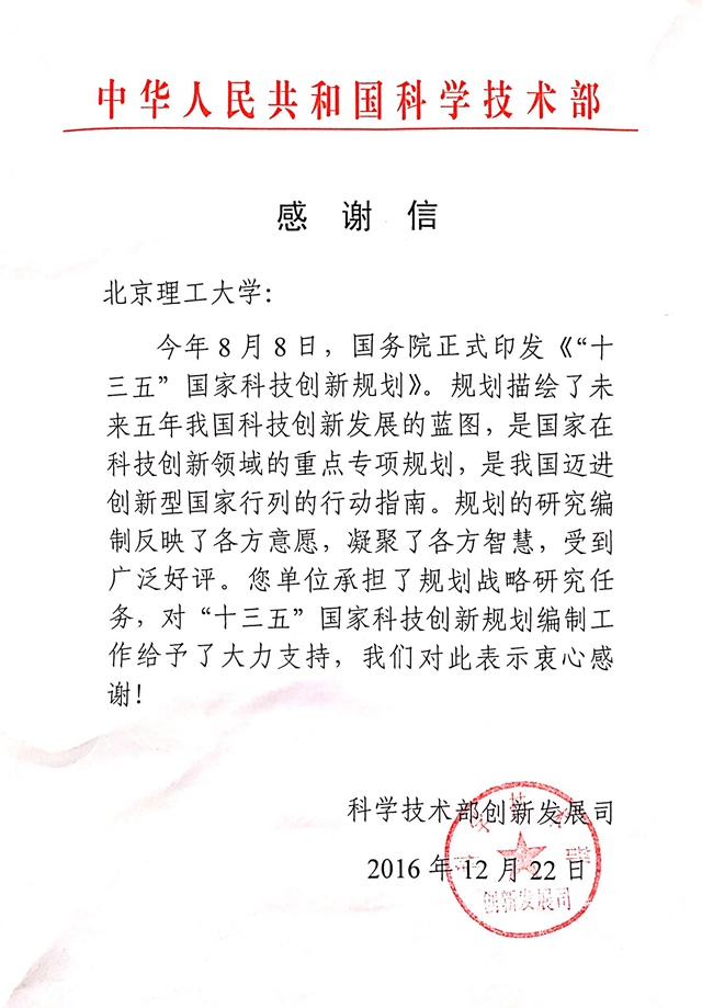 近日,国家科学技术部向北京成品人和一品二品的区别发来感谢信,感谢北理工对《“十三五”国家科技创新规划》编制工作给予的大力支持。