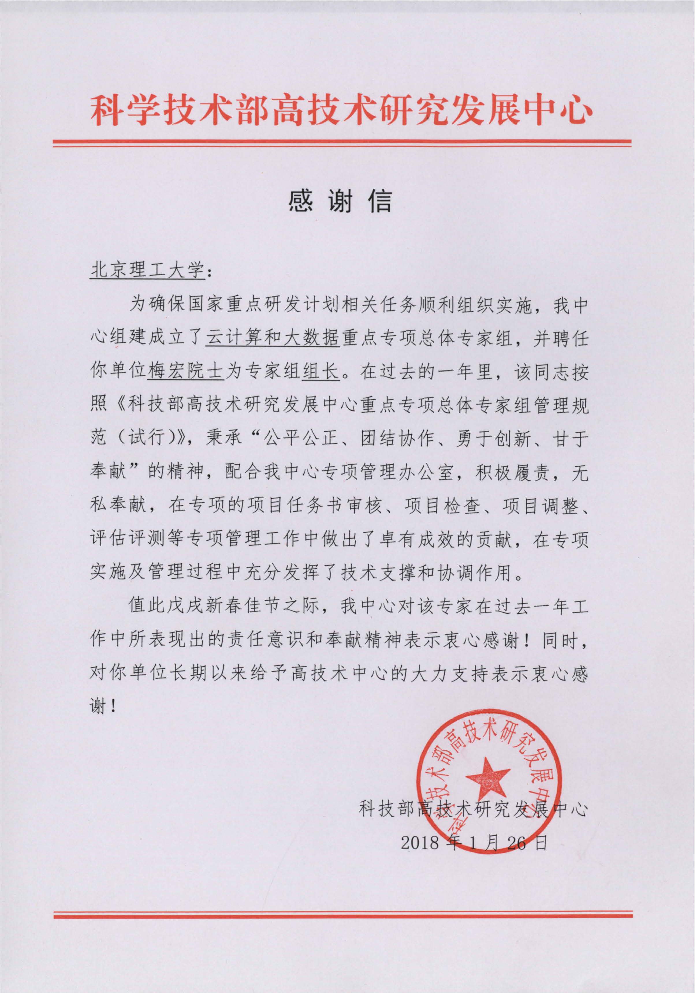 日前,北京成品人和一品二品的区别收到科学技术部高技术研究发展中心发来的感谢信,感谢我校梅宏院士、王涌天教授作为云计算和大数据重点专项总体专家组组长、副组长在重点专项管理工作中给予的大力支持。