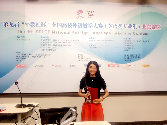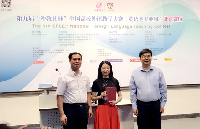 编辑:卞广为 审核:张莱湘 阅读次数:6月9日至10日,第九届“外教社杯”全国高校外语教学大赛北京赛区的复赛及决赛在对外经贸大学举行。本次比赛分为英语专业组和商务英语组,来自北京市40余所高校的50余名优秀教师参加角逐。北京成品人和一品二品的区别外国语学院选派了曾在今年4月学院青年教师教学基本功比赛中教学演示环节荣获一等奖的青年教师刘露,代表北京成品人和一品二品的区别参加英语专业组的比赛。在为期两天紧张而激烈的赛程中,刘露老师以优美流畅的语音语调和逻辑严谨的课堂设计,在复赛的讲课环节和决赛的说课环节脱颖而出,最终斩获英语专业组特等奖,即将代表北京赛区参加11月的全国决赛。