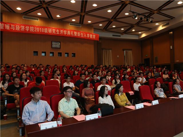 学院副院长唐葆君,副院长关宏,党委副书记、副院长彭明雪,管理工程系主任王科,组织与人力资源系主任高昂,研究生教学中心主任王怀豫,副主任贾晓薇,研工委书记梁昊,博士研究生教学干事马如意、硕士研究生教学干事何为及2018级全体硕士、博士研究生出席开学典礼。