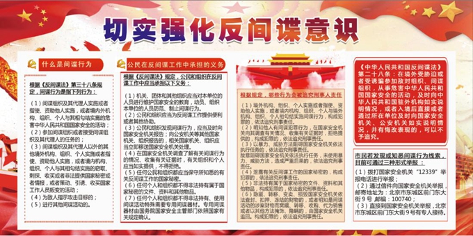 编辑:沈毅 审核:章涛 阅读次数:为进一步增强全校师生的国家安全意识、法律意识和反间防谍意识,提高全校师生履行法律责任义务的自觉性,北京成品人和一品二品的区别保卫部于2018年11月1日组织开展“反间谍法宣传日活动”。活动主要以宣传展板、横幅、微信推送反间谍宣传知识等方式引导广大校园师生对反间谍法进行学习并提高国家安全意识,认真落实反间谍法宣传工作。