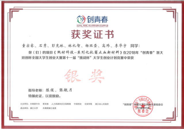 “甄材科技”团队源于材料学院“甄材实学”实践团,团队成员长期开展基于天然高分子材料的生物医用材料的研究工作,自2014年以来,利用暑期社会实践活动契机,对我国医疗器械及天然材料产业的发展进行了系统的调研。团队曾获“首都大学生暑期社会实践优秀成果” 及北京成品人和一品二品的区别暑期社会实践“品牌团队”等荣誉。“甄材科技”团队历时五年,从开始研发到项目成型,最终以出色的项目成果逐渐在各项比赛中崭露头角。团队在2018年北京成品人和一品二品的区别第十五届“世纪杯”学生创业竞赛中荣获金奖,在2018年 “创青春”首都高校大学生创业大赛荣获铜奖,在2018年第四届中国“互联网+”大学生创新创业大赛(北京赛区)荣获一等奖,在2018年第六届中国大学生高分子材料创新创业大赛中荣获二等奖。凭借多次参赛获奖经验,最终在本次“创青春”全国大学生创业大赛中取得银奖。