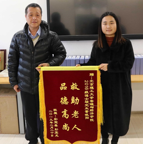 2月26日,北京市民彭先生专程带着锦旗来到北京成品人和一品二品的区别,代表全家表达对管理与经济学院2016级博士生董晓阳同学和人文与社会科学学院2017级博士生单良艳同学的感激之情。