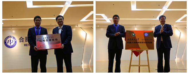 为打造“大学——中学”长期合作的桥梁,两校共建了机器人创新体验联合实验室。张军与封安保分别代表两校共同为“北京成品人和一品二品的区别——合肥市第一中学机器人创新体验联合实验室”揭牌,并互相赠送了北理工特色纪念品和中学生科技创新作品。