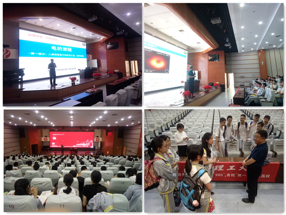 5月14日下午,信息与电子学院党委书记薛正辉教授受天津一中邀请开展“北理讲堂”活动,天津一中“领航人”郭俊芳、天津招生组王晓静老师随行,天津一中教务处副主任薛洪国老师主持讲座。薛正辉面向天津一中高一年级学生作了题为《“电”的旅程”——人类驾驭电子的历史之电、磁与电磁》的学科讲座。薛正辉教授带学生走入“电”的世界,沿着“电”的旅程,深入浅出的介绍了电磁领域的科学发现、技术进步和应用拓展的历史进程,着重讲解十九世纪电磁领域的革命性突破,以及这种突破对现代科技及人类生活的影响。该场讲座中科学家们探索和追求真理的精神激发了学生的兴趣,学术反响强烈,讲座在阵阵掌声中圆满结束。