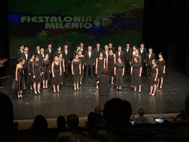 混声合唱(15-25岁组别)比赛是此次大赛的重中之重,我校合唱团进行了充分准备,参赛曲目包括我国著名作曲家翟希贤先生的无伴奏合唱作品代表作《牧歌》,这首东蒙民歌曲调含蓄、内敛、饱含深情,是一首被世界合唱领域共同认可的优秀复调合唱音乐;18世纪的西方无伴奏合唱作品《Abendlied》,该作品音乐理性和委婉,声部间不同音色的层层递进以及和声的不断转换把作品推向了更加深远的意境;《玄》是该组别比赛曲目中难度系数最高的一首无伴奏、多调性现代音乐作品,由美籍华裔作曲家陈怡创作,作品的创作灵感来源于老子的《道德经》,作曲家对中国道家文化的思考与现代音乐创作技法的结合表现出了极高的艺术水平,其中吟咏与京剧元素的出现令人耳目一新,拍手叫绝。