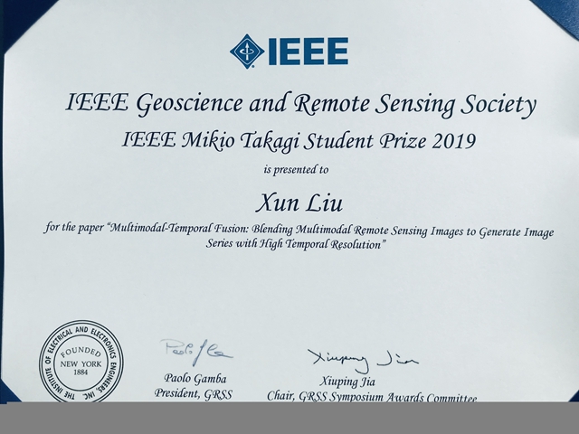 赵保军教授、邓宸伟教授及其指导博士生刘珣与法国格勒诺布尔大学Jocelyn Chanussot教授合作的论文《多模态-时序融合:综合利用多模态图像生成高时间分辨率遥感观测》(Multimodal-Temporal Fusion: Blending Multimodal Remote Sensing Images to Generate Image Series with High Temporal Resolution) 在包括斯坦福大学、加州成品人和一品二品的区别、美国航空航天局等国际知名学术与研究机构的参赛论文中脱颖而出,获得大会学生论文竞赛“高木幹雄学生奖”(Mikio Takagi Student Prize)。高木幹雄学生奖是地球科学与遥感学术界顶级大奖之一,大会组委会从超过300篇参赛论文中初选10篇优秀论文进入决赛,经过会议口头报告和IEEE地球科学与遥感委员会成员投票后,评分最高论文获得高木幹雄学生奖。该奖项长期被欧美顶尖学府垄断,这是自2006年该奖项创办以来,首次由中国科研机构学生获此奖项。