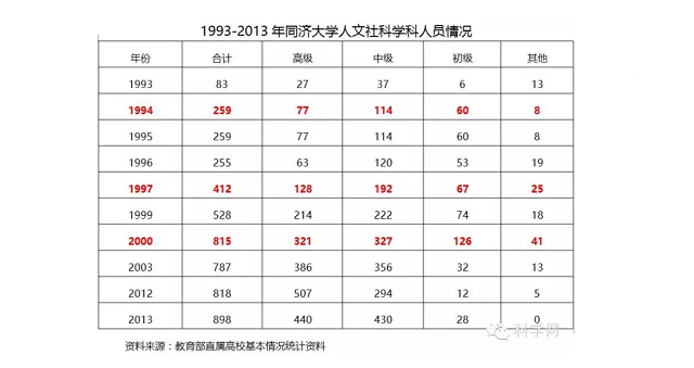 对于同济大学而言,在过去的20年里,增设了不少新的人文社会科学学科院系,文科教师队伍规模不断扩大,学校也逐步从多科走向了综合。但是,从下表可以发现,同济大学人文社会科学教师人数增长主要出现在1993-1994年,1996-1997年以及1999-2000年,这三个年份都出现了超出常规的增长,增幅分别达到212%(176人)、61.6%(157人)和54.3%(287人),其他时间段则基本维持了师资队伍的稳定。其中1996(上海城市建设学院和上海建筑材料工业学院)和2000年(与上海铁道大学合并)两次文科教师的超常增长都并非由于学校的内生增长,这种超出常规的方式,很难控制师资队伍的质量,加上人员整合和磨合需要过程,导致了同济大学文科的发展势头不如清华、交大和浙大等兄弟高校。