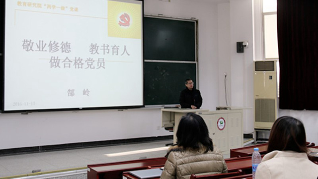 学院高等教育研究所党支部书记郜岭老师讲了“两学一做”专题党课。郜岭老师以“敬业修德、教书育人、做合格党员”为主题,结合自身的学习与从教经历,与全体党员师生分享了一名好教师、一名好党员的心路历程。