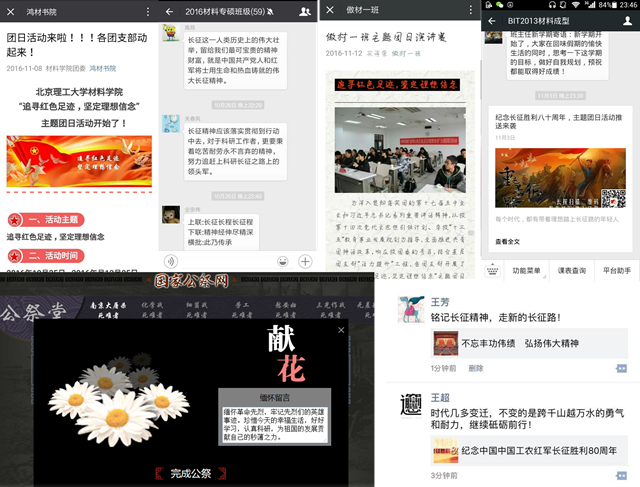 深入贯彻落实共青团第十七届五中全会和习近平总书记系列重要讲话精神,广泛开展爱国主义教育,回顾党艰苦卓绝的光辉历程,引领广大团员青年弘扬红色传统,传承红色基因,激发团员青年主动性、积极性、创造性,致力于实现“两个一百年”奋斗目标和中华民族伟大复兴的中国梦,北理工材料学院各团支部以红军长征胜利80周年,孙中山先生诞辰100周年为契机,开展了主题为“追寻红色足迹,坚定理想信念”团日活动。